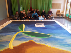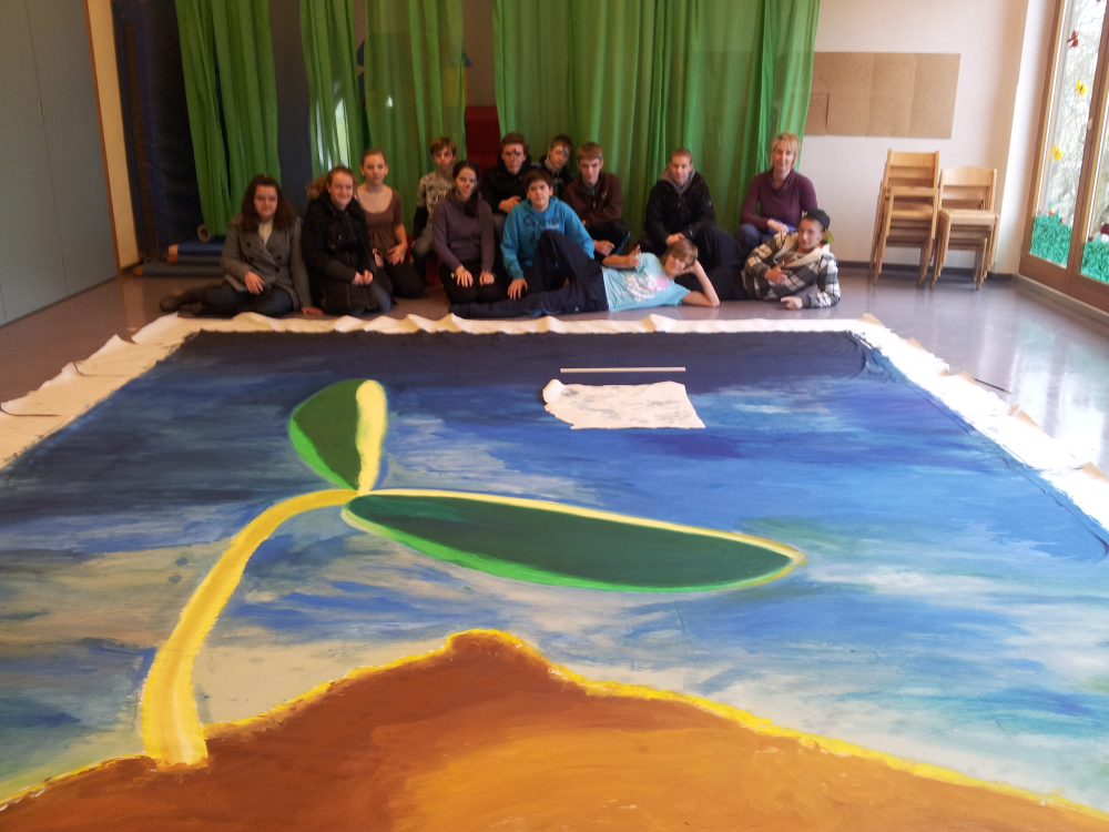 Es dauerte ein bisschen, bis diese Idee gereift war, deswegen wurde im Januar 2012 erst gemalt. Gleich zu Beginn haben sich die Konfis überlegt, ob sie lieber am genauen, kleinen und filigranen Teil des Bildes malen wollen, oder lieber eine große Fläche ausmalen. So hat sich die Gruppe in etwa in 2 Teile geteilt. Die mit dem großflächigen Anmalen haben Blau gemischt und mit großen Pinseln mit dem Himmel begonnen. Die anderen haben mit kleinen Pinseln mit Gelb und Grün die Pflanze gemalt. Nach nicht einmal 1 Stunde und 20 Minuten war alles fertig.
