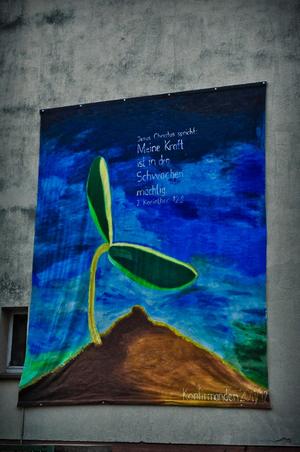 Nachdem die Konfirmanden des vergangenen Jahrgangs der Kirchengemeinde mit dem Jahreslosungsbild ein so schönes Geschenk gemacht hatten, griff der Konfirmandenjahrgang 2011/2012 diese tolle Idee auf und malte ein eigenes Bild.