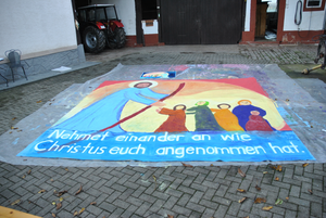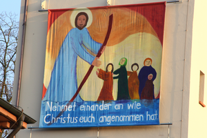 Die Konfis waren sich darin einig, dass Menschen aller gesell-schaftlichen Schichten vertreten sein sollen, eine Frau, ein Mann, jemand, der uns anschaut und ins Bild hineinnimmt und ein Mensch ohne Gesicht. Der sollte ganz bewusst kein Gesicht haben, weil wir dem Betrachter die Chance geben wollten, dass er sich ebenfalls ins Bild stellen kann.